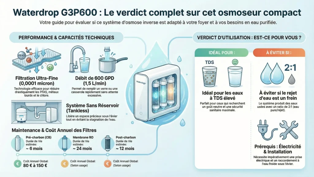 Après analyse des certifications NSF/ANSI 58 et 372, des données techniques constructeur et des retours utilisateurs, le Waterdrop G3P600 apparaît comme un compromis solide entre débit (600 GPD), compacité et coût d’entretien pour un foyer de 3 à 4 personnes.